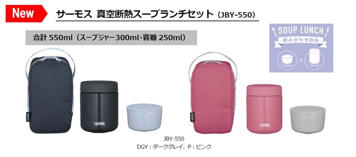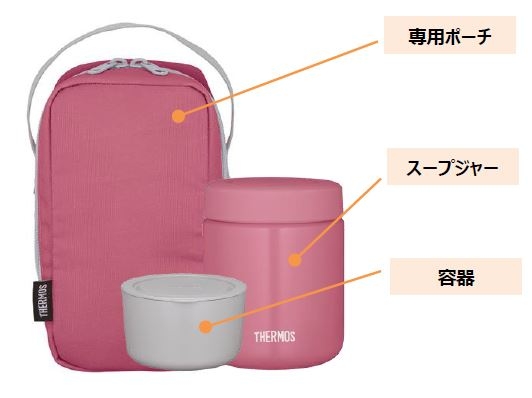 『サーモス 真空断熱スープランチセット(JBY-550)』は、普段スープジャーをご使用の方が、スープジャーにプラス一品という組み合わせで使用されていることに着目。真空断熱スープジャーに、汁漏れしにくいフタ構造の容器を加え、さらに収納にも持ち運びにも便利な専用ポーチをセットにしたアイテムです。スープジャーは食べきりサイズの300ml、容器は250mlで合計すると550mlと使いやすいサイズをご用意。専用ポーチは保温保冷に優れた断熱構造で、背面にはカトラリーを入れやすいミニポケット付きです。