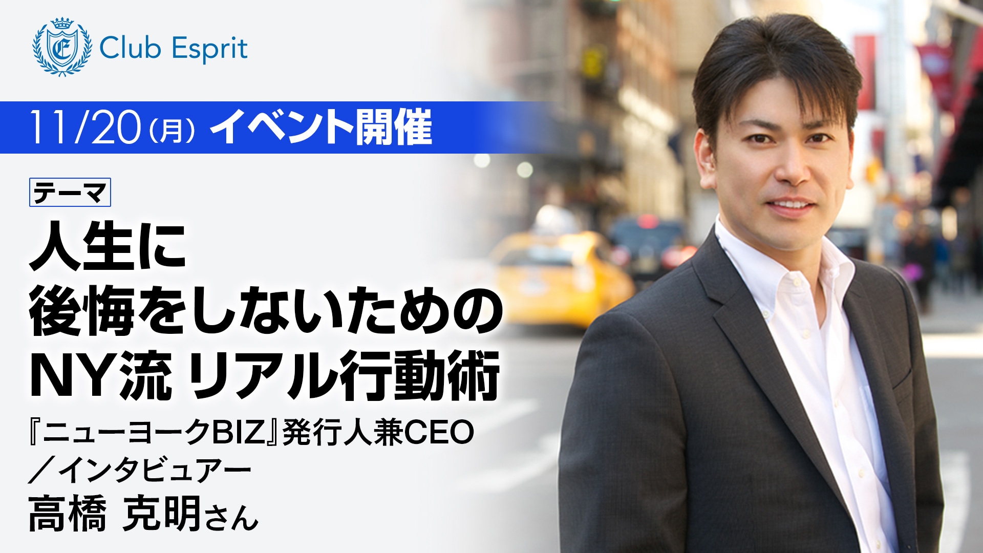 『Club Esprit』オープン後の最初のイベントとして、11月20日(月)18:00~20:00に、週刊邦字紙『ニューヨークビズ!』の発行人でインタビュアーでもある高橋克明氏をお呼びしてイベントを行います。高橋氏は、ニューヨークの最前線で日々取材に奮闘。ハリウッドスターからメジャーリーガーまで、日米の著名人100名以上に単独インタビューを実施しています。その中にはトム・クルーズ、レオナルド・ディカプリオ、北野武、渡辺謙、YOSHIKIなど、様々なジャンルの著名人がいらっしゃいます。