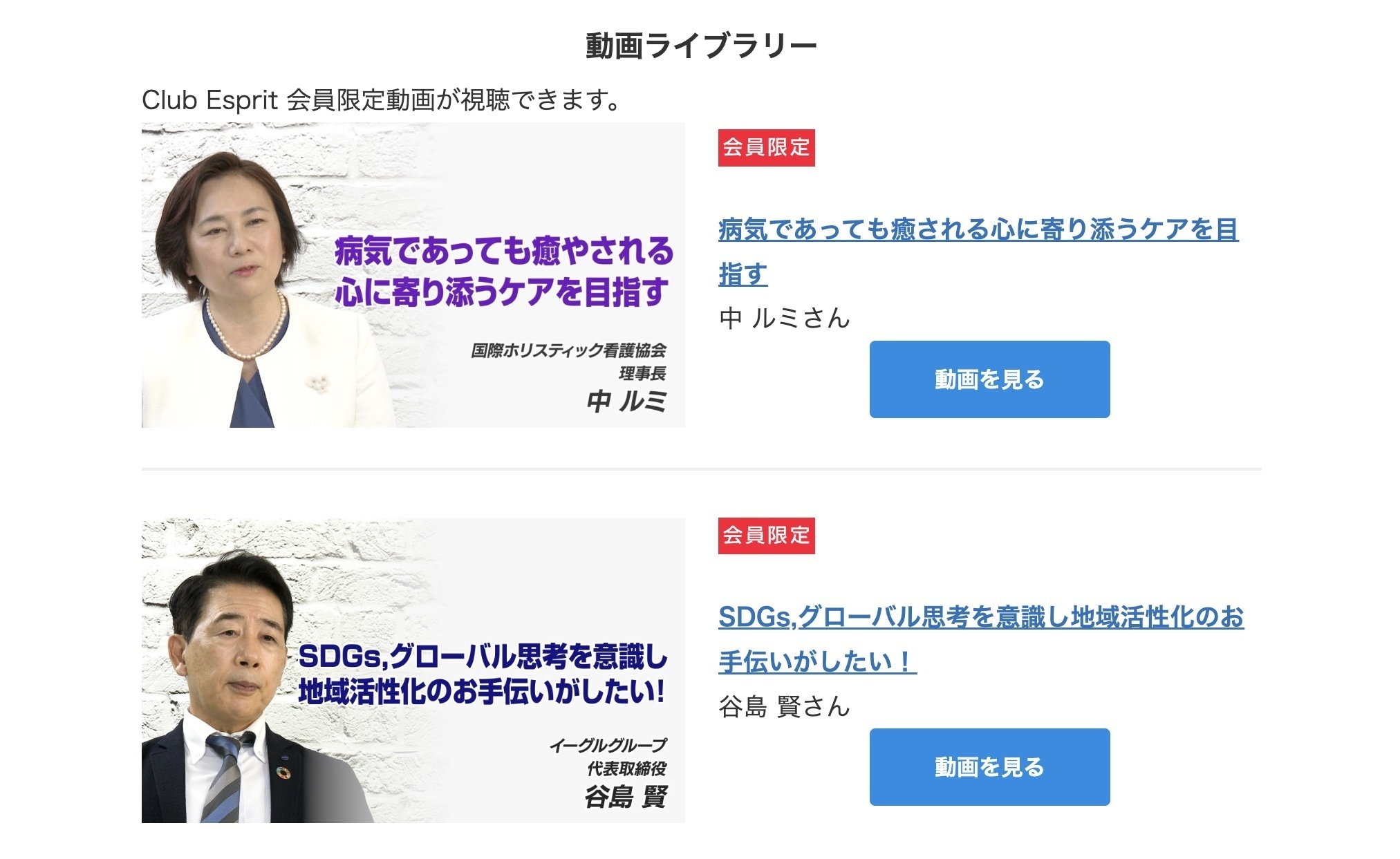 (2) 動画ライブラリー(見放題):各界で活躍する『Club Esprit』賛同者がメッセージを贈ります。