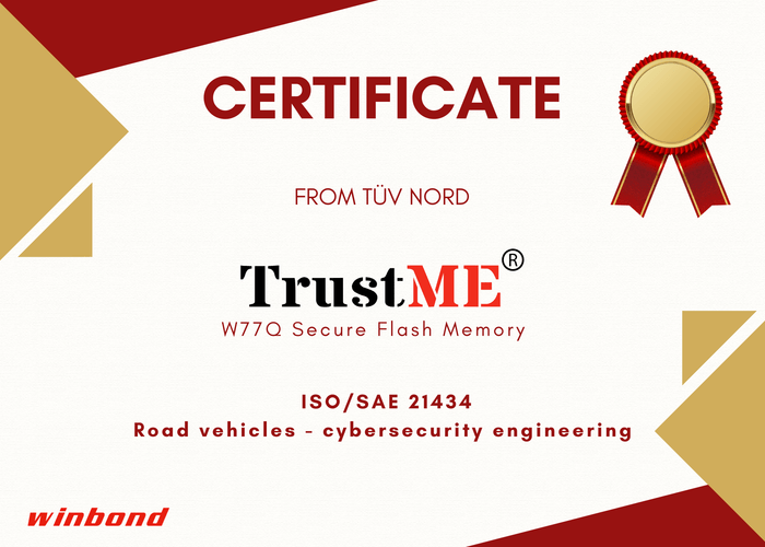 (2023-08-08台湾台中市発)――半導体メモリソリューションの世界的リーディングサプライヤーである、ウィンボンド・エレクトロニクス株式会社は、同社のTrustME(R) W77Qセキュアフラッシュファミリーが車両のサイバーセキュリティ技術の国際標準規格であるISO/SAE 21434認証を取得したことを発表しました。本認証は車両OEMメーカーを筆頭とした自動車業界全体にとって重要なものであり、ウィンボンドはフラッシュベンダーとしては世界で初めてこの標準規格認証を取得したことになります。