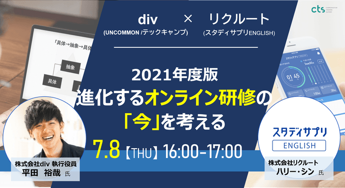 企業向け語学研修の株式会社シー・ティー・エス(本社:大阪府大阪市北区、代表取締役:岩名 葵)は、2021年7月8日(木)16:00より企業の研修担当者向けに『2021年度版進化するオンライン研修の「今」を考えるセミナー』を開催致します。本セミナーでは、株式会社div(本社:東京都 渋谷区、代表取締役:真子就有)と株式会社リクルート(本社:東京都千代田区、代表取締役社長:北村 吉弘)よりゲストスピーカーをお招きし、オンライン研修の進化系プログラムを解説致します。