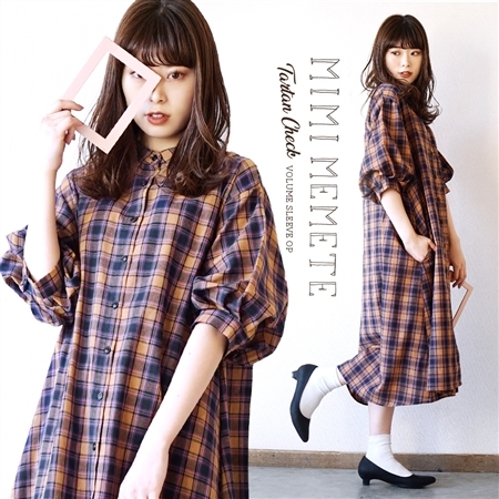 MIMIMEMETE:ボリュームタックスリーブ チェックワンピース販売ページURL:https://ezk.page.link/dfLJ