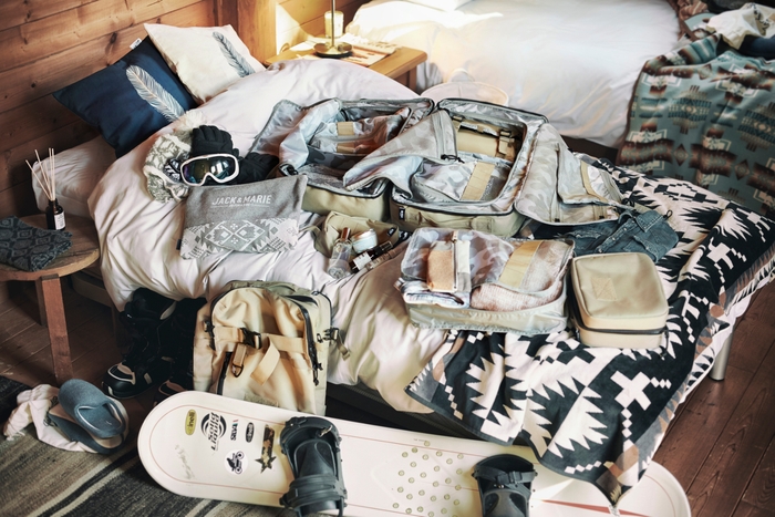JACKとMARIEが過ごすWinter Resortでスポーツもアフターも楽しむための優雅なホテルライフを背景に、明日のスノーボードを楽しむための準備はもちろんのこと、今から楽しむディナーも部屋もおしゃれに彩るアイテムは、どこを切り取っても二人のセンスが感じられます。