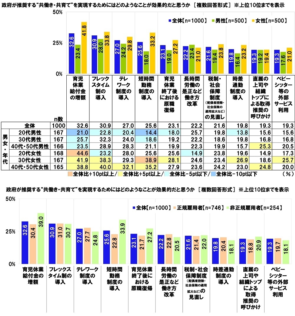 全回答者(1,000名)に、政府が推奨する“共働き・共育て”を実現するためにはどのようなことが効果的だと思うか聞いたところ、「育児休業給付金の増額」(32.6%)が最も高くなりました。金銭的な面での支援が手厚くなることで、“共働き・共育て”の推進が図られると考える人が多いようです。次いで高くなったのは、「フレックスタイム制の導入」(30.9%)、「テレワーク制度の導入」(27.0%)、「短時間勤務制度の導入」(25.6%)、「育児休業終了後における原職復帰」(23.1%)でした。