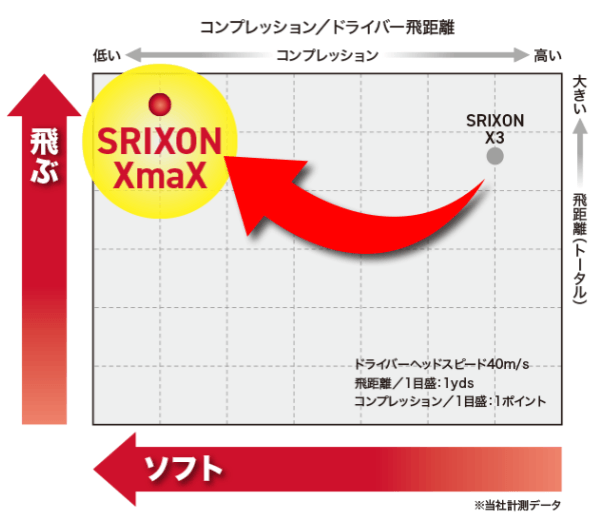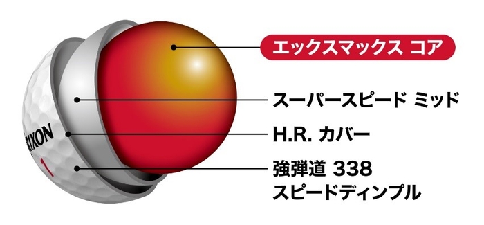 ボールの心臓部であるコアには、飛びとソフトな打感という相反する要素を両立させるために、約10年の自社研究を経てようやく発見した反発性能の高い材料を配合。細かなチューニングを繰り返した結果、やわらかいのに高反発・高初速を生む「エックスマックスコア」を完成させました。