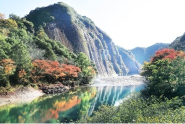 清流の対岸にそびえる一枚の岩は、岩というより「山」と言ったほうがしっくりくる大きさです。横幅を見ても、高さ仰ぎ見ても、見飽きることの無い迫力の風景が広がります。秋は清流沿いの樹々も色づく、紅葉鑑賞もお薦めのスポットです。