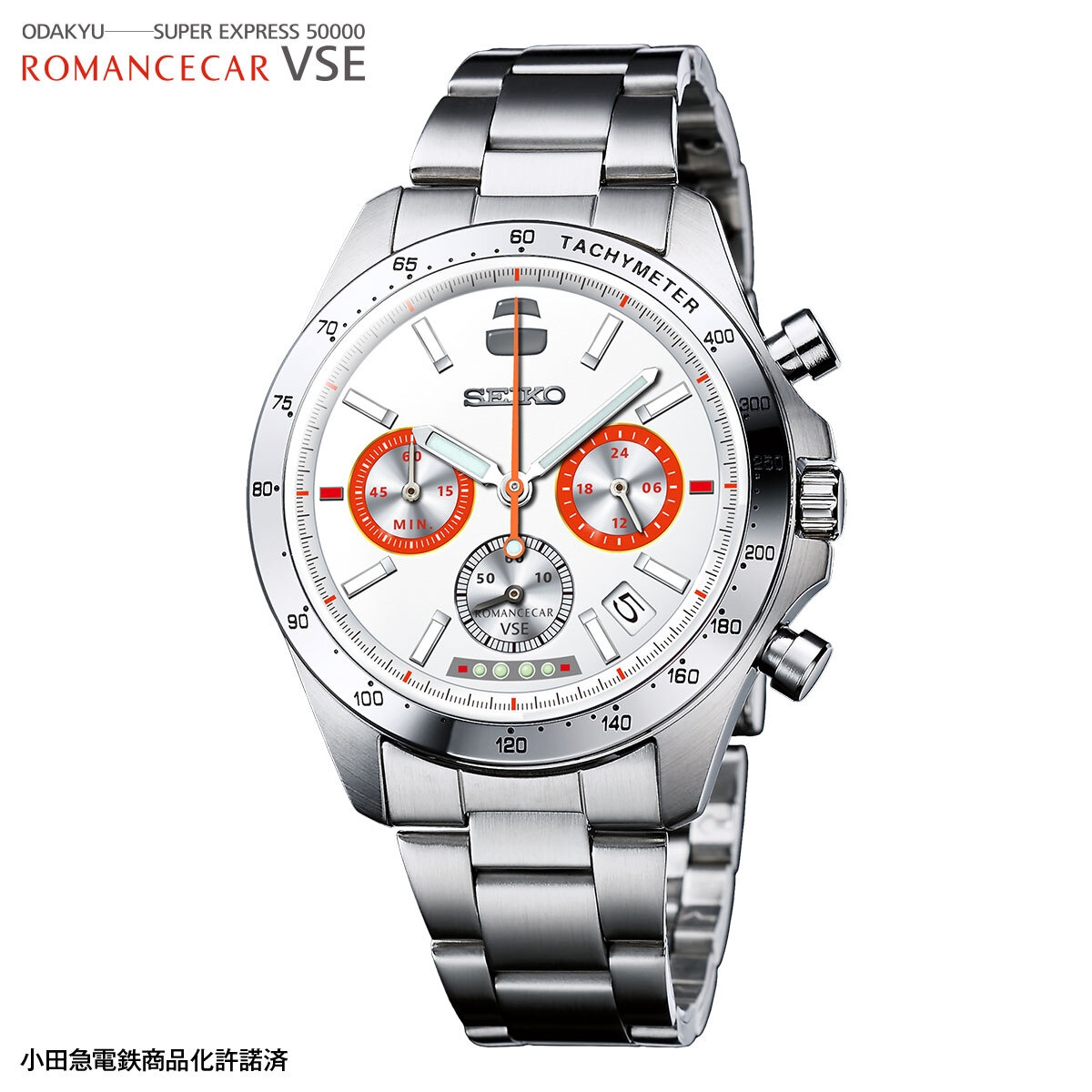 ロマンスカーVSEをイメージしたシルキーホワイトのフェイスに、ストップウオッチ機能や24時間針、カレンダー機能を搭載。
