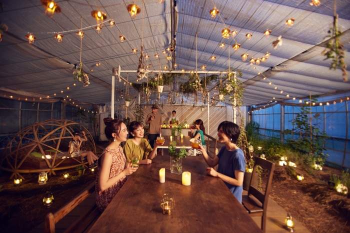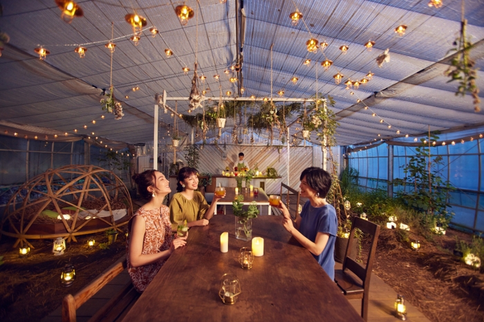 アグリガーデン内のグリーンハウスで育てているハーブはこの時期に最盛期を迎えます。青々と茂ったハーブに囲まれた席やドライハーブを敷き詰めたドーム型のソファに座り、爽やかな香りを楽しみながらリラックスできます。また、日が暮れてきた後は、ハウス内がライトやランタンの灯りに照らされ、より幻想的な空間で過ごすことができます。