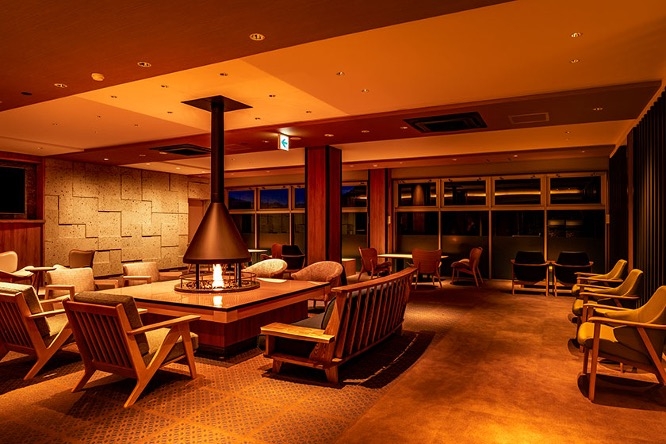 ご到着時や湯上りはもちろん、夜になると火が灯るラウンジ中央の暖炉の周りには多くのお客様が集い、お酒やお茶を片手にゆったりとしたひと時を楽しまれています。