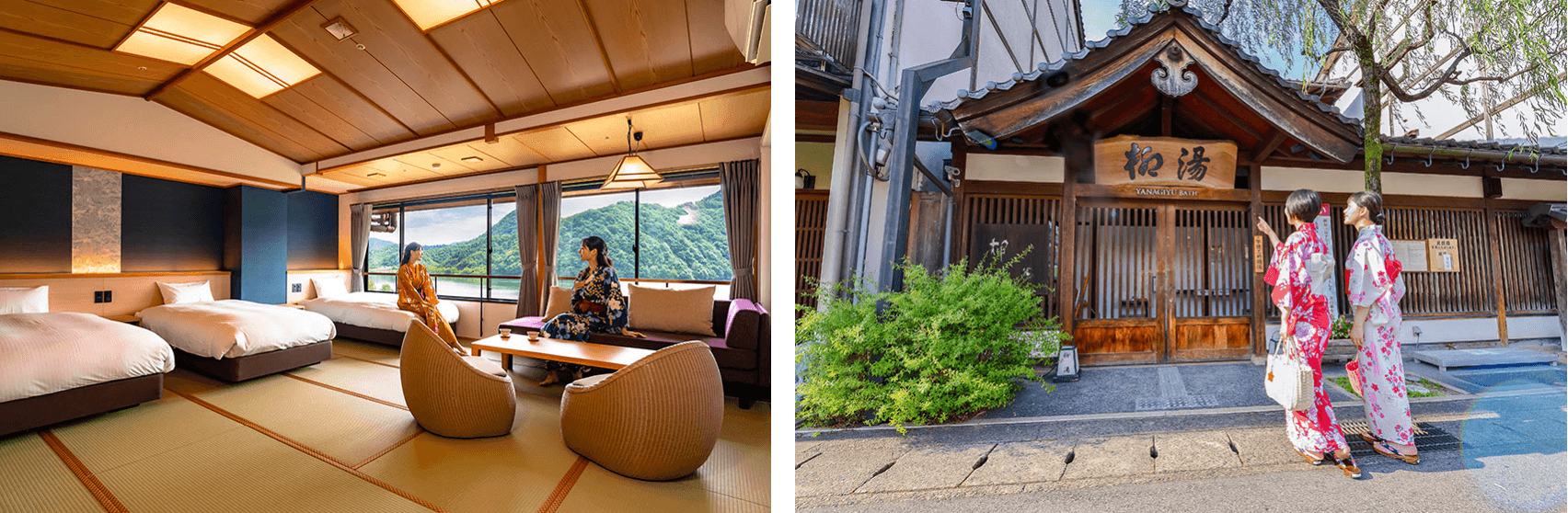 右:城崎温泉と言えば外湯めぐり。城崎温泉街の中心部まで徒歩でも約10分程度。外湯めぐりの無料バスも運行しているためロケーションの良さも魅力です。浴衣に籠を持って日中はもちろん、秋の夜長の散策もお薦めです。