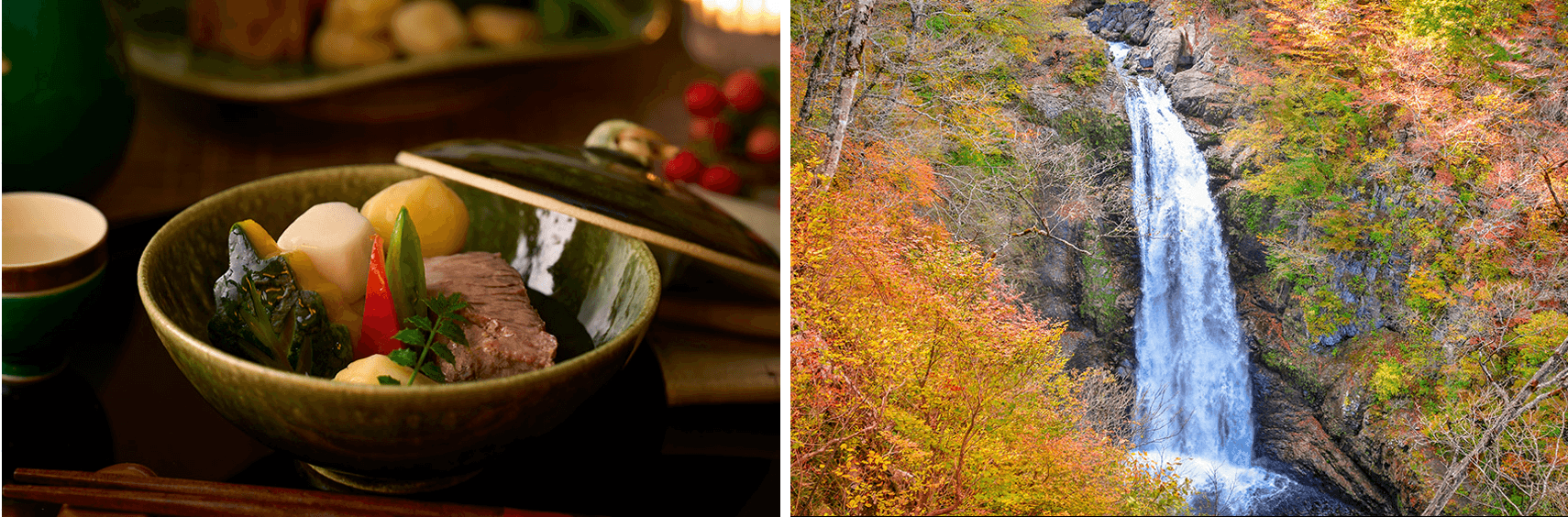 右:ホテルから車で約20分の「秋保大滝」。日本三名瀑のひとつに数えられ、豪快な滝の流れを取り囲むように色づく紅葉をお楽しみいただけます。例年の見頃は10月中旬から11月下旬頃まで。