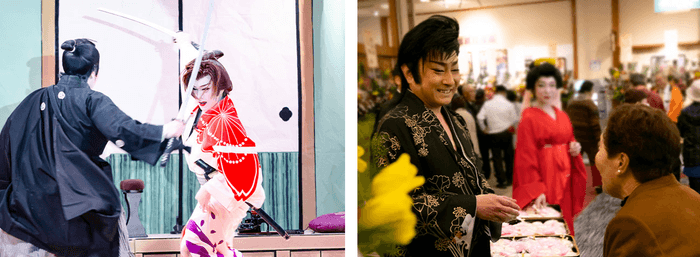 右:1か月ごとに劇団が変わるため、月ごとに異なる劇団の熱演をお楽しみいただけます。「推し」の劇団や役者さんがいるお客様が多く、公演後の記念撮影や言葉を交わすことができる、距離の近さも魅力です。