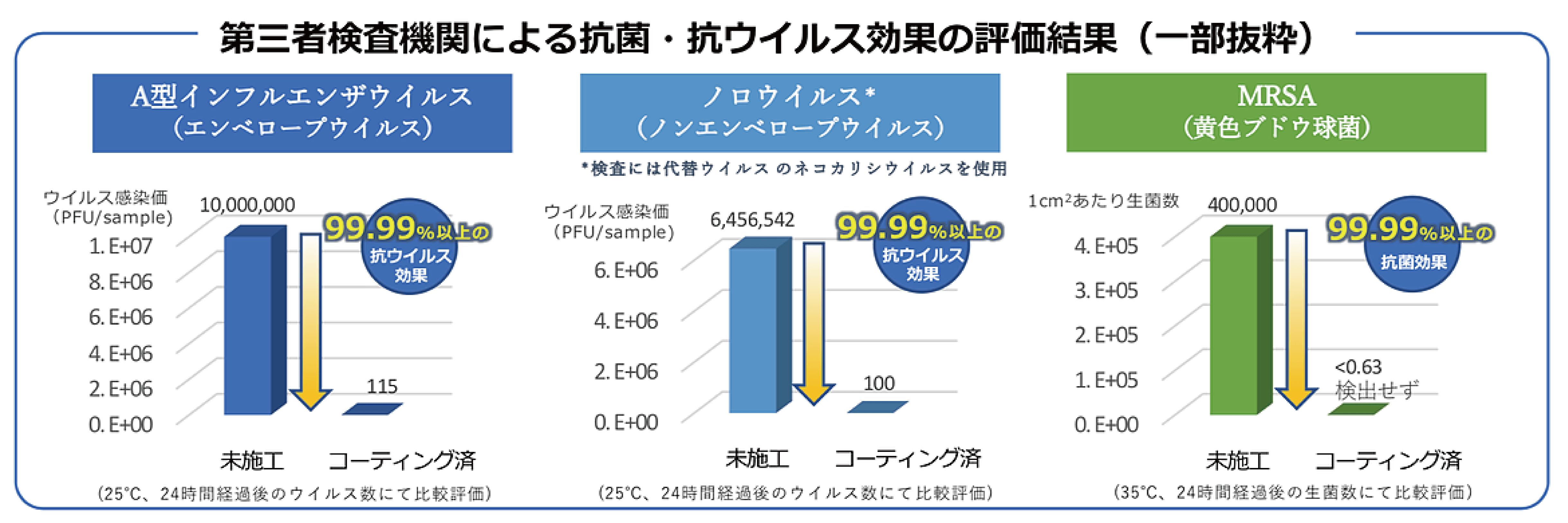 また、エタノールや次亜塩素酸スプレーは噴射の都度菌やウイルスを不活化しますが「噴射して揮発後、次に噴射するまでの間」には効果がありません。つまり、頻繁な噴霧を要し、維持するためには膨大な手間と人件費を要します。しかし、持続性抗菌・抗ウイルスコーティングは除菌の持続時間が1年と長く、噴射回数が少なくできるため、長期的にみると安価です。