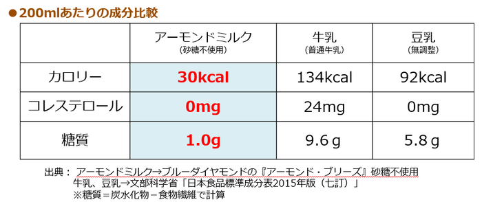 アーモンドミルクは牛乳、豆乳と比較して低カロリー、低糖質。さらにコレステロールゼロでヘルシーな飲み物です。また、乳糖のようなアレルギー物質を一切含まないことから、牛乳を飲めないアレルギー体質の方でも安心して飲むことができます。