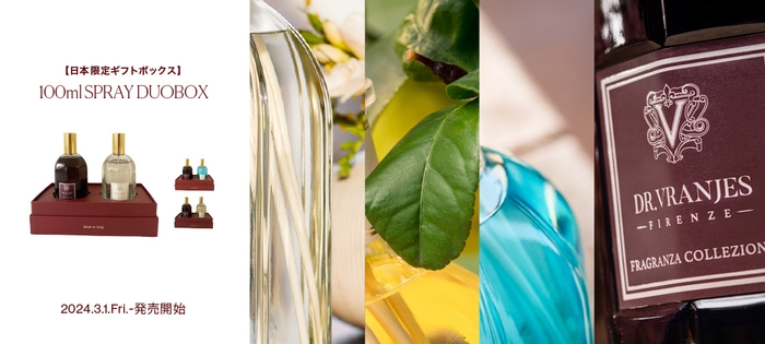 株式会社Dr. Vranjes JAPANはこのたび、イタリア・フィレンツェ発のルームフレグランスブランド「ドットール・ヴラニエス」より、100mlサイズのルームフレグランススプレー2本を特別なボックスにセットした新たなギフトボックス「100ml SPRAY DUOBOX」を日本限定で2024年3月1日(金)に発売いたします。