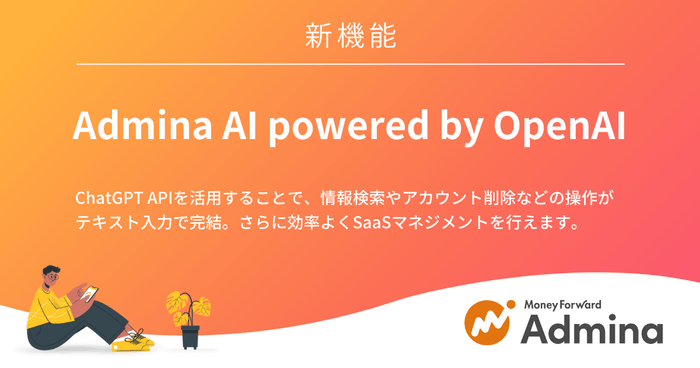 マネーフォワードi株式会社は、SaaS管理プラットフォーム『マネーフォワード Admina』(以下「Admina」)において、ChatGPT APIを活用した新機能「Admina AI」の提供を2023年6月より開始します。参照したい情報をテキスト入力するだけで、情報検索や、アカウント削除などの操作がテキスト入力で完結し、SaaSマネジメント業務が効率化します。