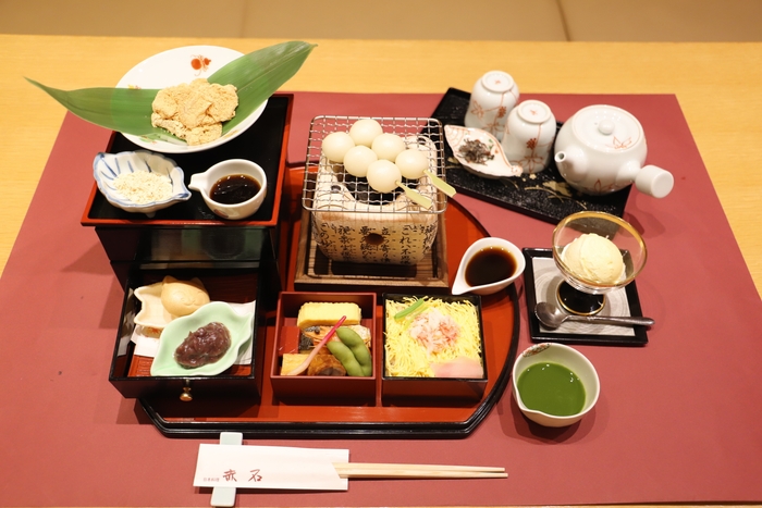 甘味箱には、口の中でとろーりとろける国産わらび粉を使った自家製わらび餅、七輪でお好みの焼き加減で味わえる自家製みたらし団子、粒の大きな北海道産小豆を使った自家製粒餡(あん)を挟んで味わえる最中がセットになっています。