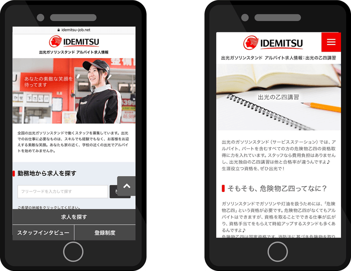 検索エンジン対策のしくみを備えた、応募者を集めやすいウェブサイトです。出光サービスステーション各店は、いつでも自由かつ簡単な操作で求人情報を掲載・更新できます。新規応募者へのスピード対応など、応募者を逃さない工夫がなされています。