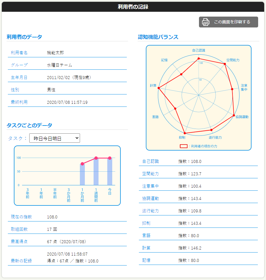 複数の認知機能に関わるデジタルパズルの結果を、当社独自の特許※で9つの領域ごとに集計し、グラフとチャートで明示します。それらを見ることで、本人には自分の得意・不得意が分かり、日々の成長を確認することができます。保護者や支援者には、子どもの認知機能の状況を常に把握しながら、個別支援に役立てることができます。