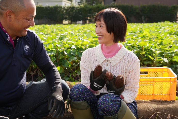 撮影中はいも掘りに夢中?! 松本さんの激レア「農家ファッション」にも注目