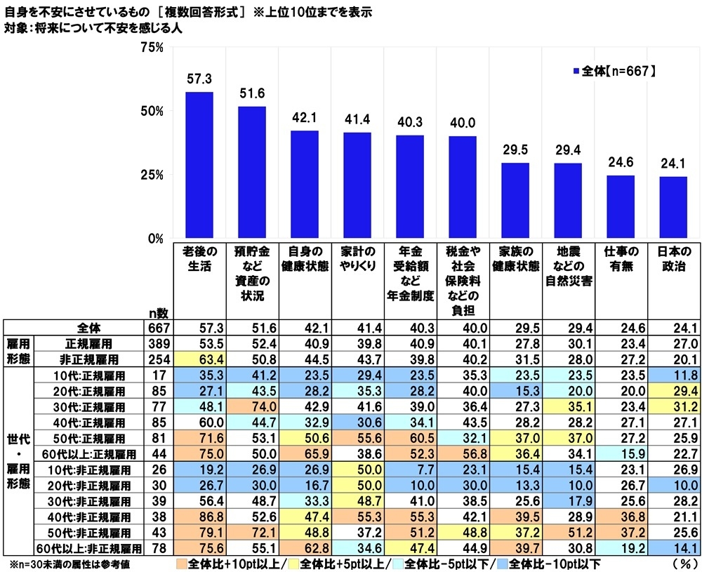 連合調べ 「将来について不安を感じる」66.7%、 60代以上女性では75.0% 自身を不安にさせているもの 1位「老後の生活」2位「預貯金など資産の状況」