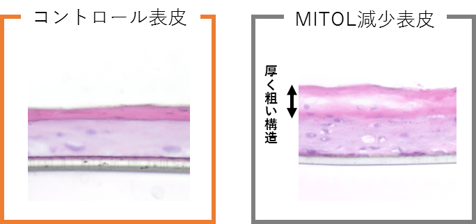 そこでまず、肌の透明感やうるおいに重要な表皮形成に及ぼすMITOLの影響を検討しました。その結果、老化した細胞ではMITOL量が明らかに減少していることがわかりました(図1)。また、MITOLを減少させる処置を施した肌細胞から表皮構造を形成させると、老化した肌でも認められるような厚く粗い構造となっていることが確認されました(図2)。これらのことから、老化によってMITOLが減少し、表皮形成異常が生じている可能性が示唆されました。