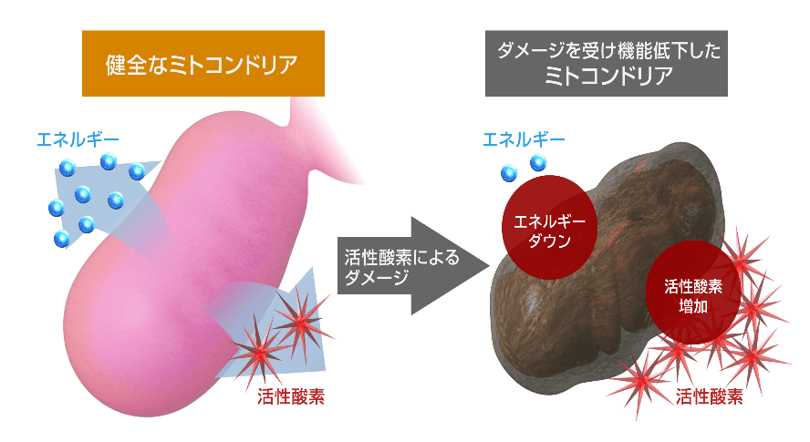 ミトコンドリアはエネルギーを生み出す一方で、有害な活性酸素も同時に発生する。活性酸素によるダメージはミトコンドリアに蓄積し、ミトコンドリア機能が低下する。