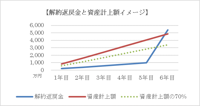 ① 法人が役員や従業員を被保険者として、低解約返戻型生命保険(例:年間保険料600万円、契約後5年間は解約返戻金率が払込保険料の20%と低く、6年目の解約返戻率が90%に上がるような商品)を契約する