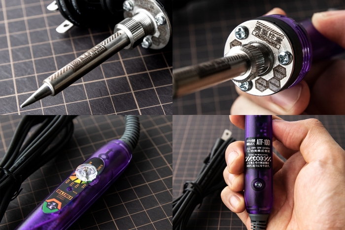 「A.T.FIELD ダイヤル式温度調節はんだごて」はエヴァ初号機・2号機・零号機をモチーフにしたはんだごてです。はんだごては電子工作などで使われる道具で、「はんだ」という金属を溶かして電子部品などを接続するために使われます。温調機能などプロ仕様の性能を1本のグリップに凝縮しつつも、基盤が透けて見えるメカニカルなクリアカラーや金属部分に施されたレーザーマーキングによってエヴァンゲリオンの世界観が表現されたモデルです。