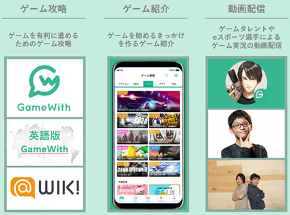 ゲーム情報メディア「GameWith」は、ゲームを有利に進めるための情報を提供する「ゲーム攻略」、ゲームを見つけるための情報を提供する「ゲーム紹介」、専属のゲームタレント及びeスポーツ選手が動画プラットフォーム上で行う「動画配信」等を配信しています。