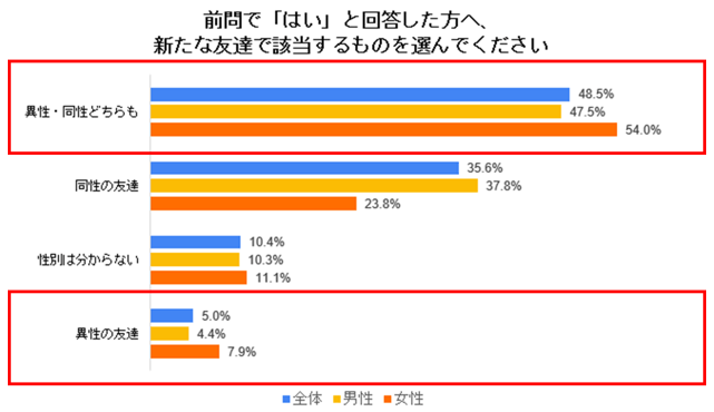 「できた」と回答した人に該当するものを質問したところ、「異性・同性どちらも」と回答した人が約半数という結果となった。