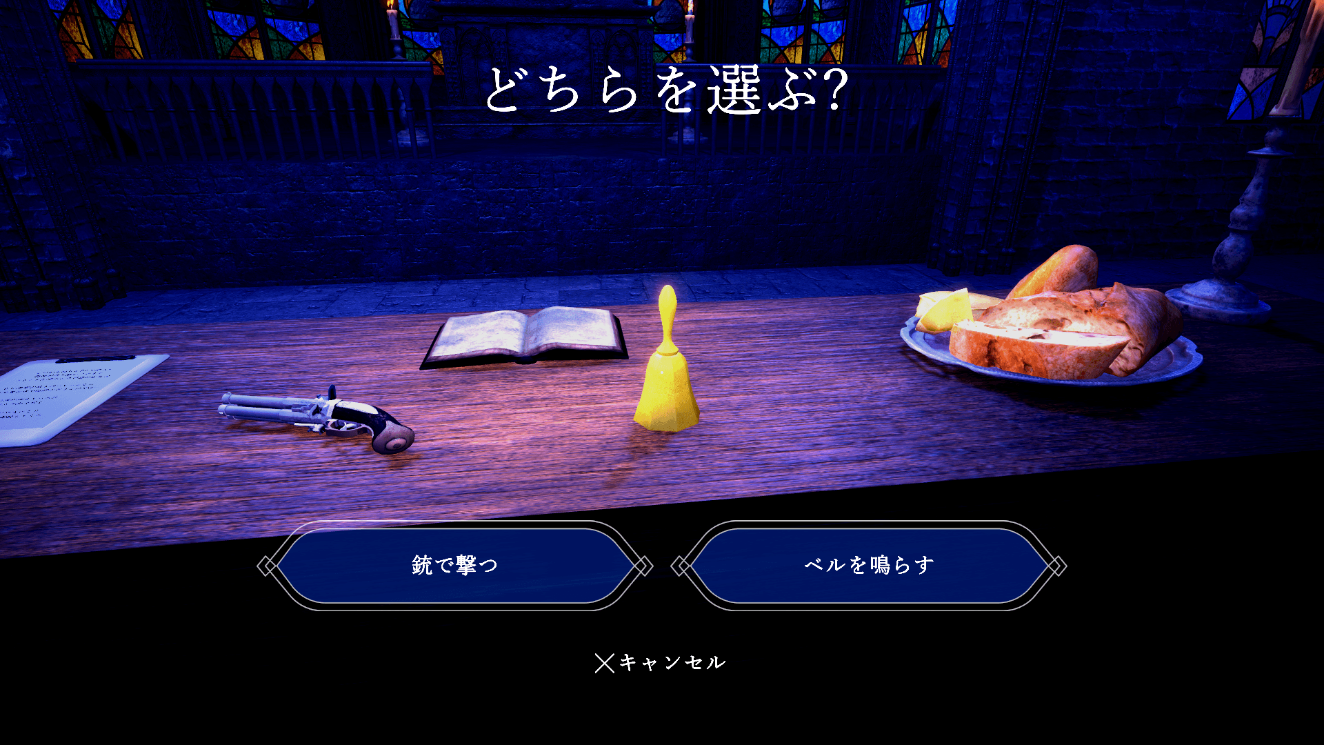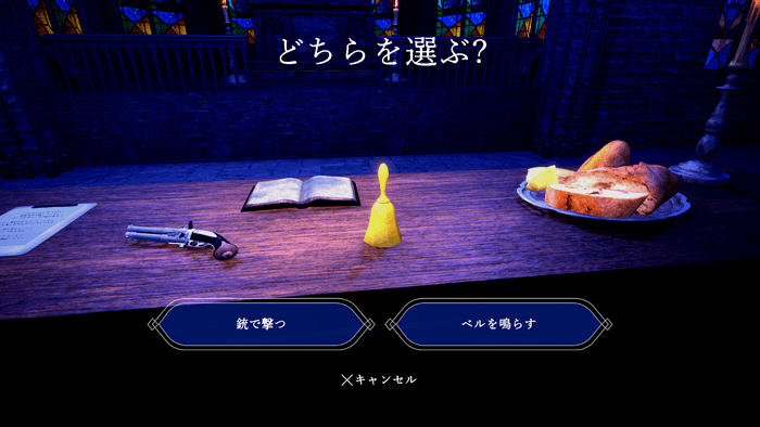 銃を撃つのか、ベルを鳴らすのか…正しい選択をすれば次へ進めますが、間違えると最初に戻り、ループするシステムになっています。