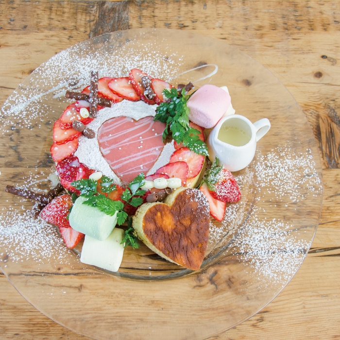 とちおとめとカスタードをあわせた、特製いちごソースの泉にパンケーキをたっぷりと絡めてお召し上がりください。お好みで練乳をかけるとより甘~いソースに。見ても食べても美味しい、バレンタインにぴったりな甘酸っぱいパンケーキをお楽しみいただけます。