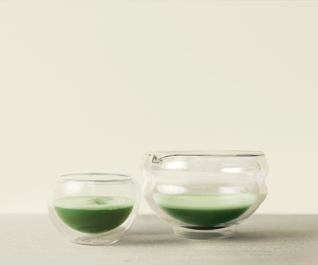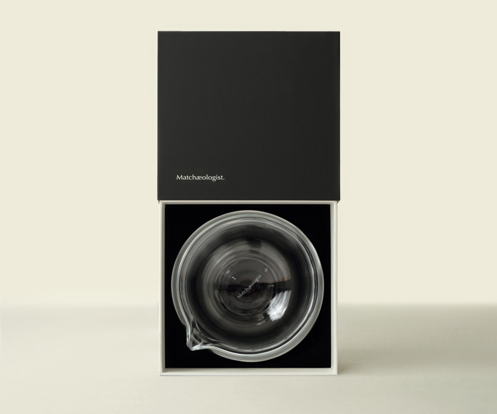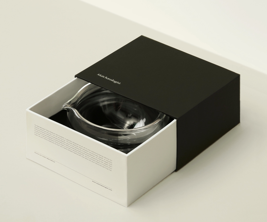 現代的なライフスタイルにフィットする徹底したミニマリズムと機能性を併せ持つMatchaeologistのプロダクトは、これまで茶葉のほかにダブルウォールの手吹きガラスのモダンな茶碗、茶碗に合うよう設計された長尺の茶せん、そして茶杓でした。今回は数人分の抹茶を一度に点てられる伝統的な片口茶碗の、現代版であり美しいアートピースさながらのガラス製の片口茶碗“Glass Katakuchi Serving Bowl”が誕生しました。