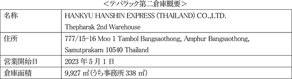 当社タイ法人であるHANKYU HANSHIN EXPRESS (THAILAND) CO.,LTD.は、バンコクの南東約35kmに位置するバンプリー地区にあるテパラック倉庫に隣接する「テパラック第二倉庫」を開設し、5月1日より営業を開始します。