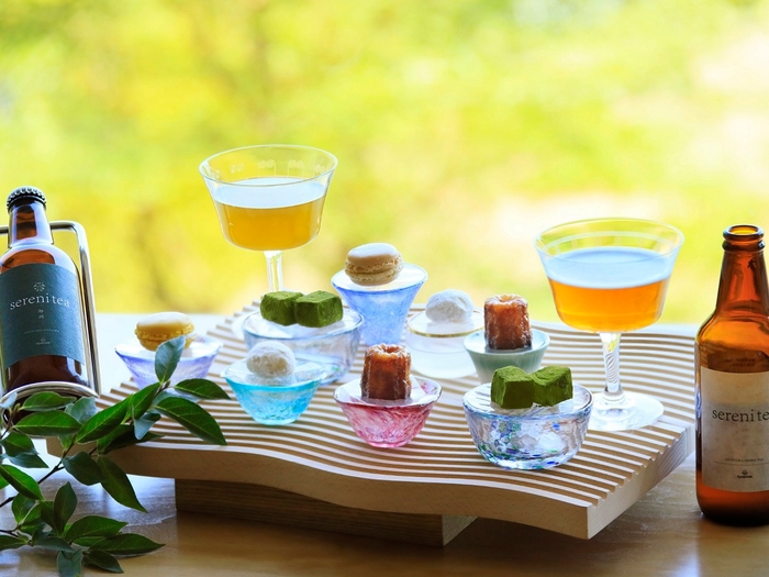 スパークリングティーは静岡の「静」からイメージした静けさや平穏を意味するsereni tea(セレニティ)というオリジナルボトルにてご提供します。