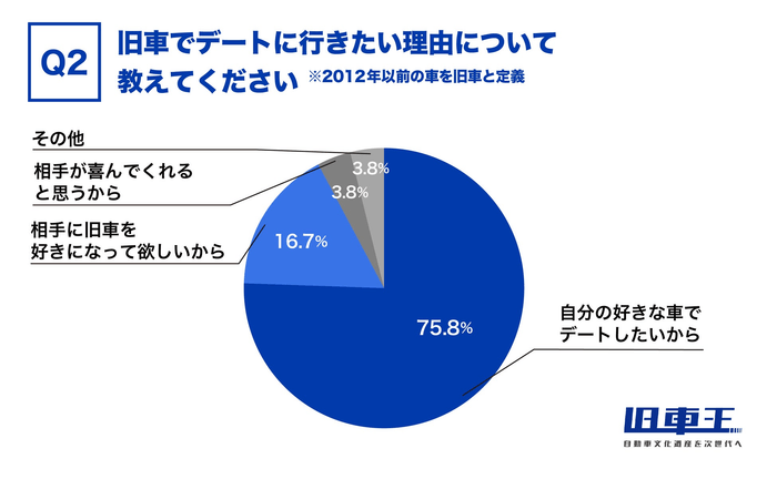 Q1で「旧車でデートに行きたい」と答えた方にその理由について聞いてみると、最も多かった回答が「自分の好きな車でデートしたいから」で75.8%でした。