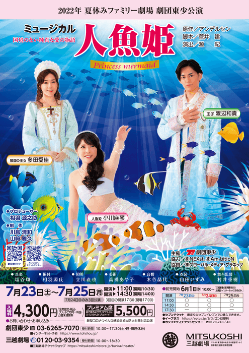 有限会社 劇団東少(東京都杉並区)主催、2022年夏休みファミリー劇場 劇団東少公演 ミュージカル『人魚姫』が2022年7月23日 (土) ~2022年7月25日 (月)に三越劇場(東京都中央区)にて上演されます。チケットはカンフェティ(運営:ロングランプランニング株式会社、東京都新宿区、代表取締役:榑松 大剛)にて発売中です。