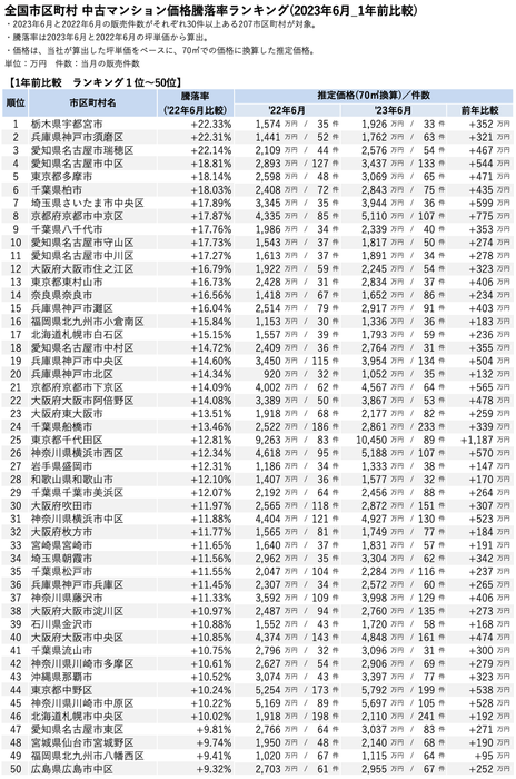 「マンションレビュー」2023年6月 全国市区町村 中古マンション価格/騰落率ランキング100を発表