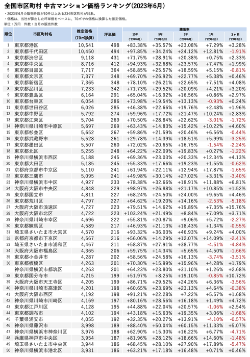 • 2023年5月の価格ランキングでは上位10件以内に「神奈川県川崎市中原区」がランクインしたが、6月は再び東京都23区で占められた。