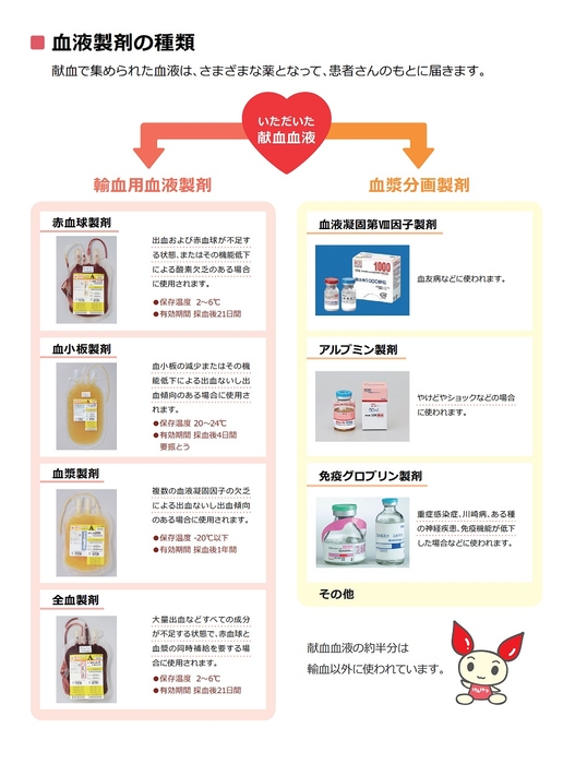献血された血液は検査等を受けて血液製剤となり、有効利用されております。