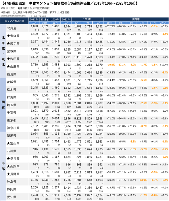 ■47都道府県別 中古マンション相場推移(2013年10月~2023年10月)