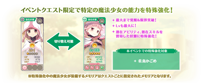 対象の魔法少女を編成して本イベントクエストをプレイする際にステータスを特殊な状態に強化することができます。