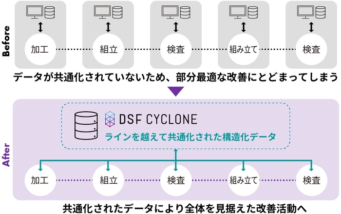 そのような生産現場において、全工程の担当者が総合的な評価の指標を元に“共通の物差し”で改善点を議論するためには、上流から下流までのデータを標準的に取得、構造化、可視化していくことが必要となりました。そこでマクニカの製造現場DXサービスであるDSF Cycloneの導入を決定しました。