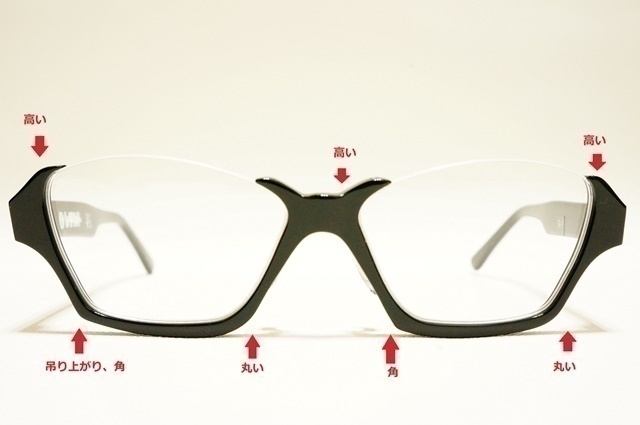 このRechildというブランドは、左右のレンズに1箇所ずつ突起の様なアクセントをデザイン処理として施しています。そのデザイン手法は右利き用であれば、線対称の様に右目の上と左目の下(※2)に左右非対称にアクセントをつけます。これによって揺らぎの存在する人の顔にシンクロするかのように馴染むのです。つまり世界で唯一似合うメガネが無いと嘆く方に提案できるメガネなのです。この効果は左右非対称なお顔であればある程にその効果も増していきます。