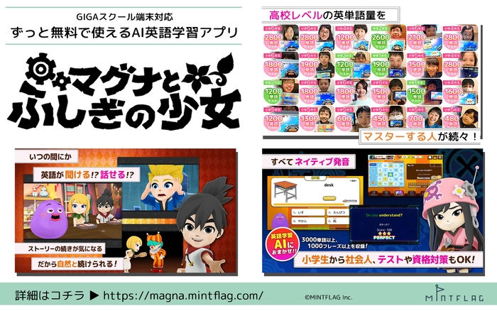 GIGAスクール端末対応版『マグナとふしぎの少女』は、全国の教育機関で無料でご利用いただけます。アプリは小学校から大学受験までをカバーするのべ3,000単語を収録し、フォニックスを含む発音練習や定型文のフレーズ学習、AIキャラとの英会話などもすべて無料でご利用いただけます。