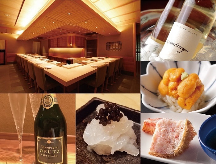 コース内容は、先付、旬の刺身、白海老とキャビア、毛蟹、9貫の握りと巻物、デザートに『ドゥーツ ブリュット・クラシック』または『あさつゆ asatsuyu』のハーフボトルが付いたコースで2時間から2時間半くらいかけてゆっくりお酒やつまみ、にぎりを愉しむことができます。