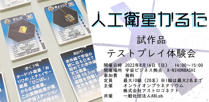 株式会社アストロコネクト(本社:神奈川県川崎市多摩区 代表取締役:荒井大作、以下、アストロコネクト)は、東京・日本橋にある宇宙ビジネス拠点「X-NIHONBASHI」にて、個性豊かな日本の人工衛星たちと出会える”人工衛星かるた”の試作品テストプレイ体験会を8月14日に開催いたします。