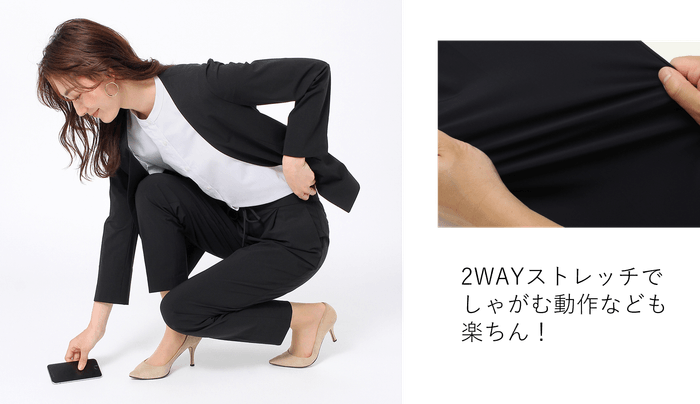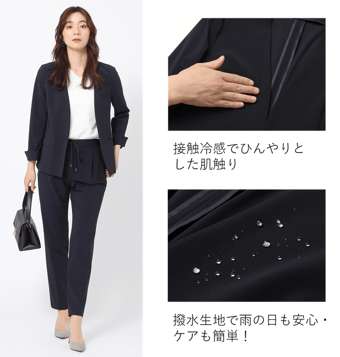 さらに、シワになりにくく家庭洗濯も可能となっているなど、優れたイージーケア性も魅力です。ジャケットは前襟のないノーカラーで、かつ裏地を可能な限り省き、前ボタンや袖ボタンのないボタンレス仕様(前はホック留め)にすることで、カーディガンのような軽やかな着心地を実現。パンツはウエストにゴム素材を取り入れることで、座った時などに感じやすいお腹回りの窮屈感を和らげます。