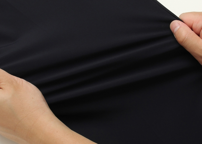 今回発売するスーツの生地には高密度(ハイゲージ)ニットを採用しています。糸を高密度に編み込むことで目の詰まった生地に仕上げ、ニット生地特有の高い伸縮性(2WAYストレッチ)をもちながら、ほどよいフォーマル感を演出します。また、この生地は接触冷感性を備え、暑い夏でもひんやりとした肌触りを体感できる他、撥水性もあり梅雨時期の雨対策はもちろんのこと、飲み物をこぼしてしまった際なども安心です。